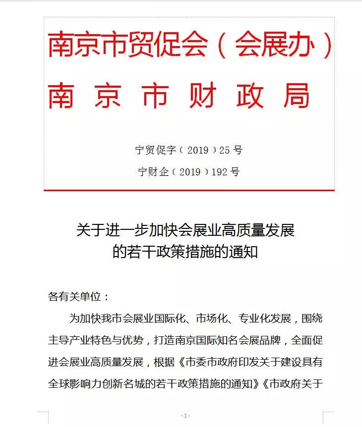 南京市貿(mào)促會(會展辦)和南京市財政局于6月13日正式印發(fā)《關(guān)于進一步加快會展業(yè)高質(zhì)量發(fā)展的若干政策措施的通知》,制定了一系列扶持會展業(yè)、展館、品牌會展項目、國際會議和引進會展人才的政策。