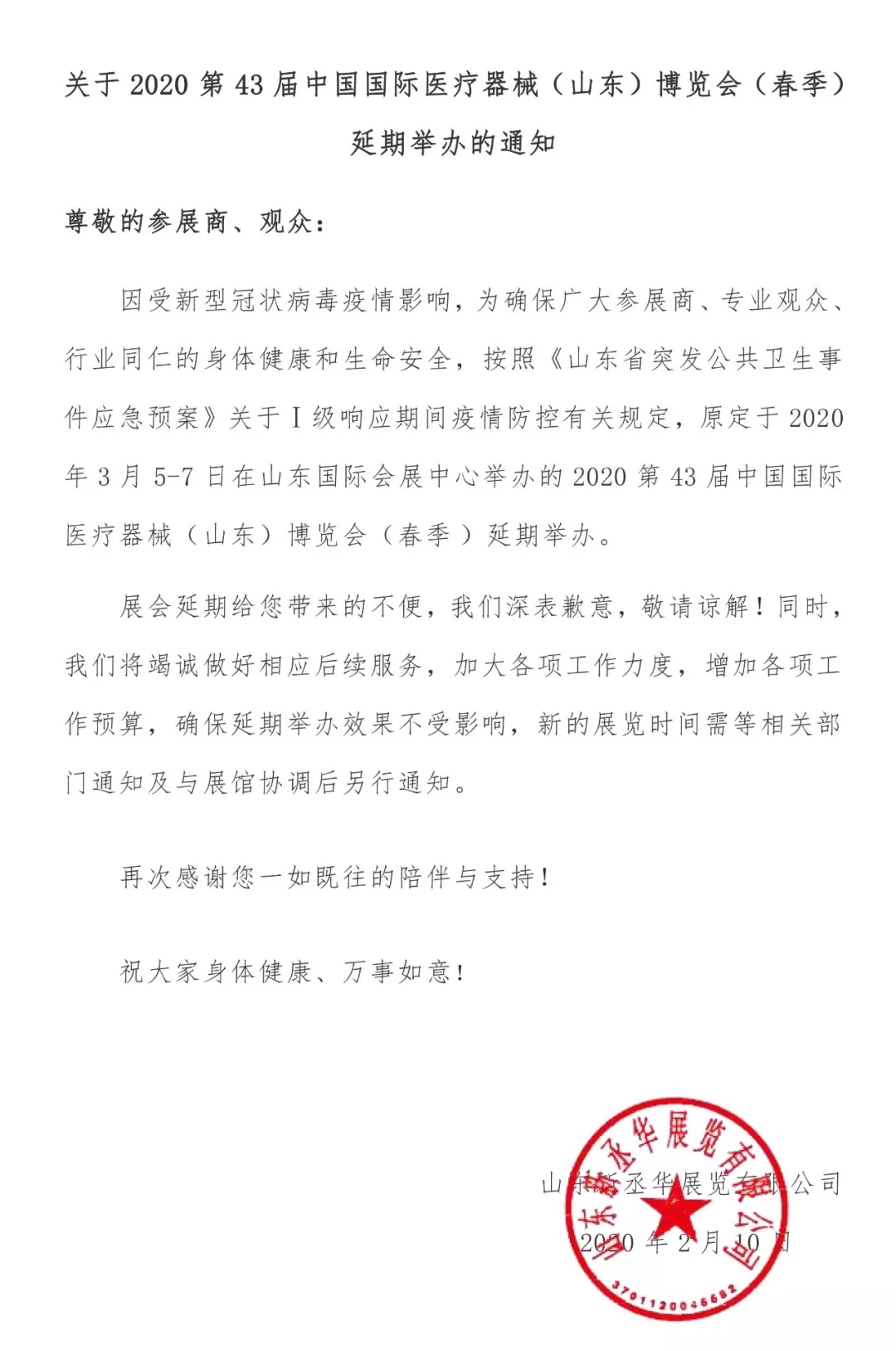 關(guān)于2020第43屆中國國際醫(yī)療器械(山東)博覽會(huì)延期的通知