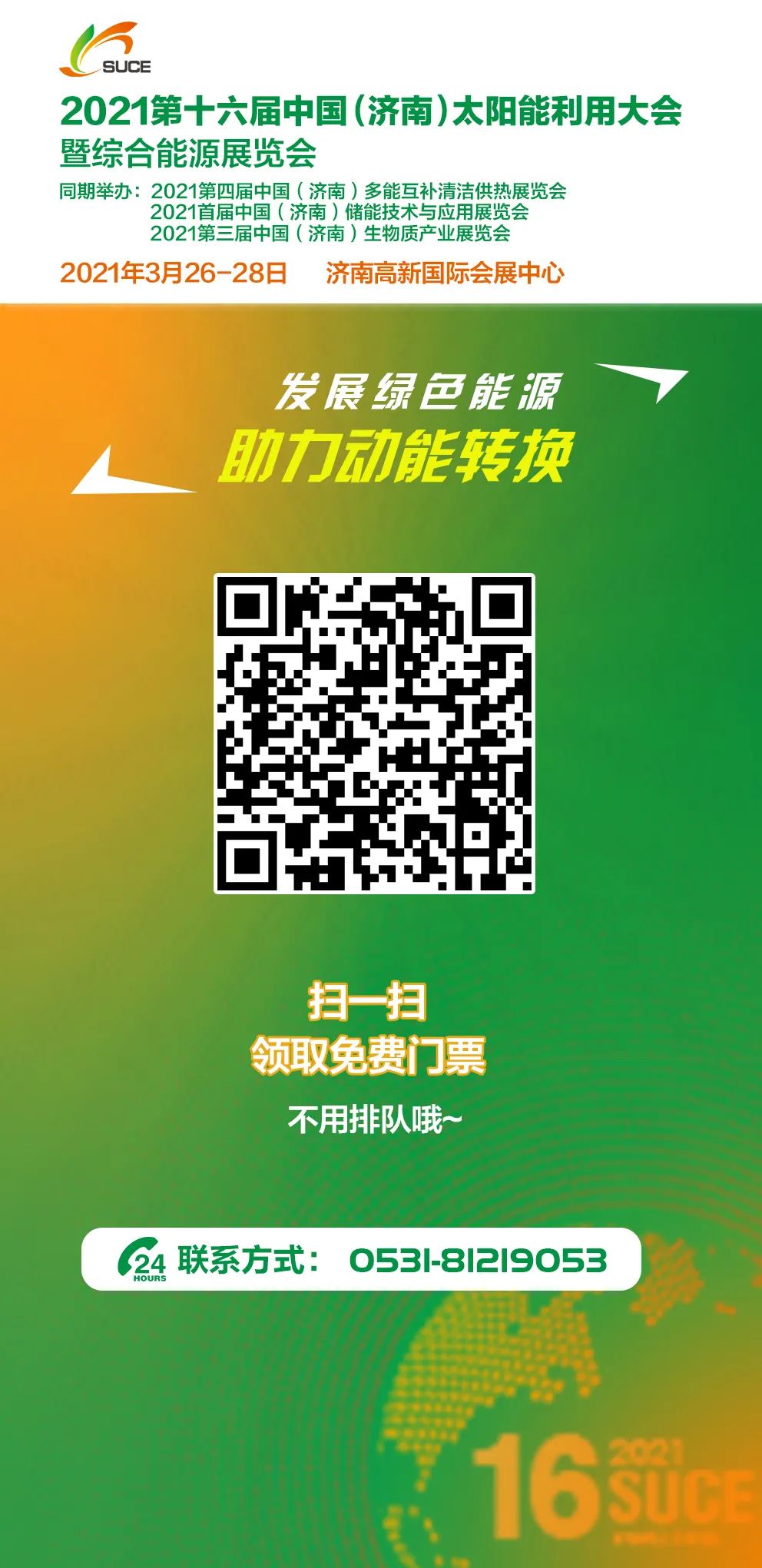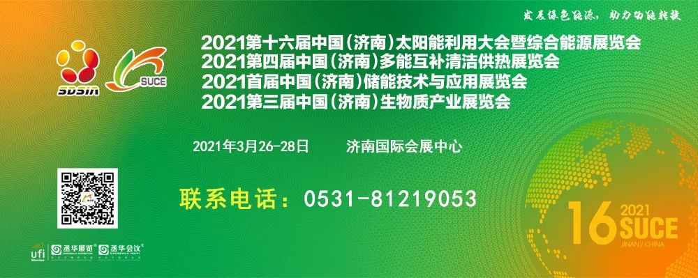 2021第十六屆中國(guó)(濟(jì)南)太陽能利用大會(huì)暨綜合能源展覽會(huì)將于2021年3月26-28日在濟(jì)南高新國(guó)際會(huì)展中心舉辦,展會(huì)主題是“發(fā)展綠色能源,助力動(dòng)能轉(zhuǎn)換”。綜合能源的互補(bǔ)利用是未來主流的發(fā)展模式,本次大會(huì)以綜合能源應(yīng)用為核心,涵蓋太陽能光伏、光熱、空氣能、生物質(zhì)能、風(fēng)能、電能、儲(chǔ)能、智能微網(wǎng)、綠色照明、氫能等多種能源互補(bǔ)的應(yīng)用模式,大會(huì)將掀開未來能源發(fā)展的新篇章。