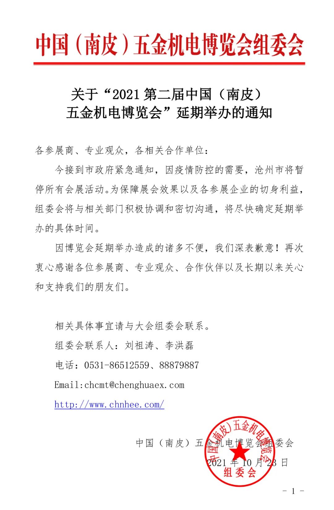 因疫情防控需要,原定于10月28-30日在滄州國際會展中心舉辦的第二屆南皮五金展將延期舉辦。