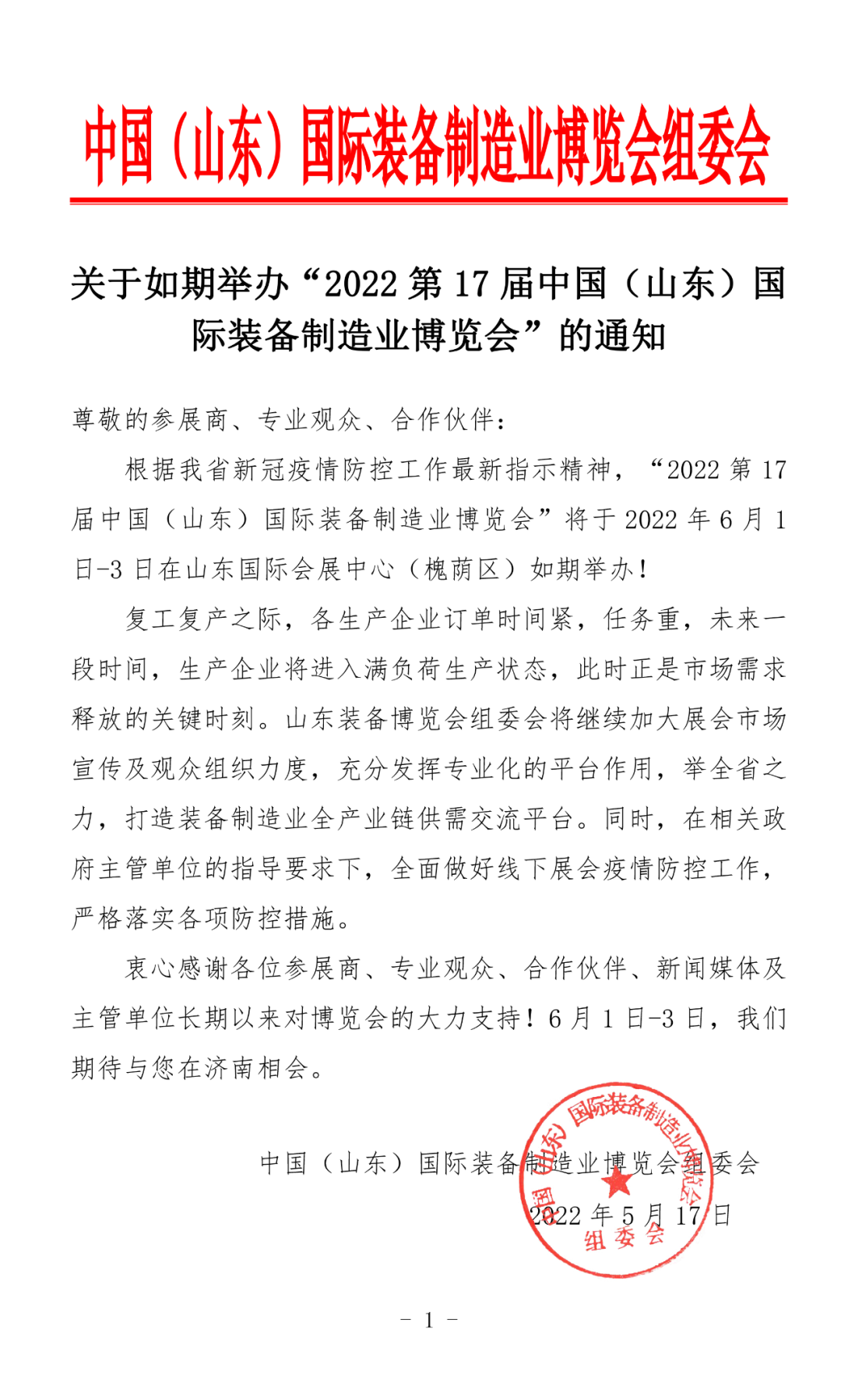 根據(jù)我省新冠疫情防控工作最新指示精神,“2022第17屆中國(山東)國際裝備制造業(yè)博覽會”將于2022年6月1日-3日在山東國際會展中心(槐蔭區(qū))如期舉辦!
