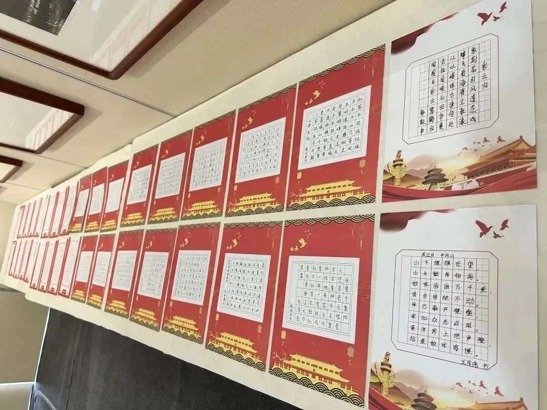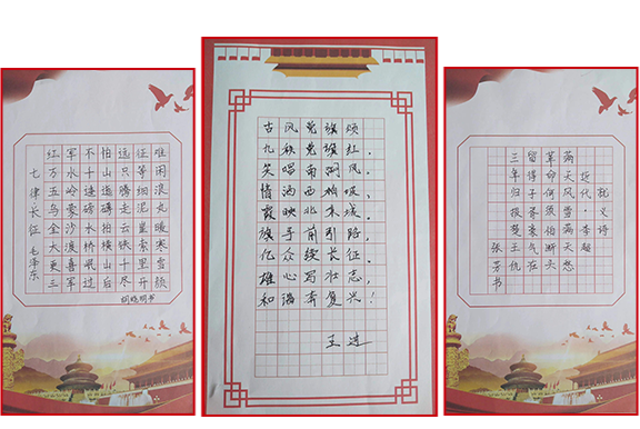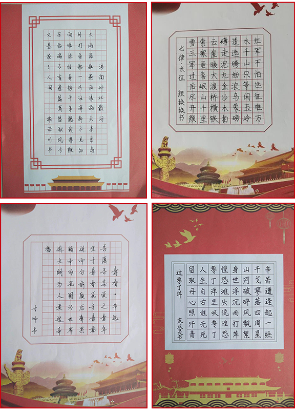 以史為鑒,可知興替;以詩為馬,莫負韶華。本次參加活動的黨員們用堅定的筆觸,澎湃的心情重溫革命語錄、抄寫紅色詩詞,字里行間深切地感受黨的光輝發(fā)展歷程。書寫的作品結構均勻,筆畫流暢,橫平豎直整齊美觀,落筆之處或輕或重,或緩或急,橫、豎、撇、捺、點間,可以看出大家的認真態(tài)度。“紅軍不怕遠征難,萬水千山只等閑”、“雄心寫壯志,和諧奔復興”、“漫天風雪滿天愁,革命何須怕斷頭”、“雄關漫道真如鐵,而今邁步從頭越”……從一篇篇的抄錄作品中,我們仿佛又看到了中國共產黨那段艱苦卓絕的奮斗歷程,體會了革命先烈不屈不撓、英勇頑強的大無畏氣概。