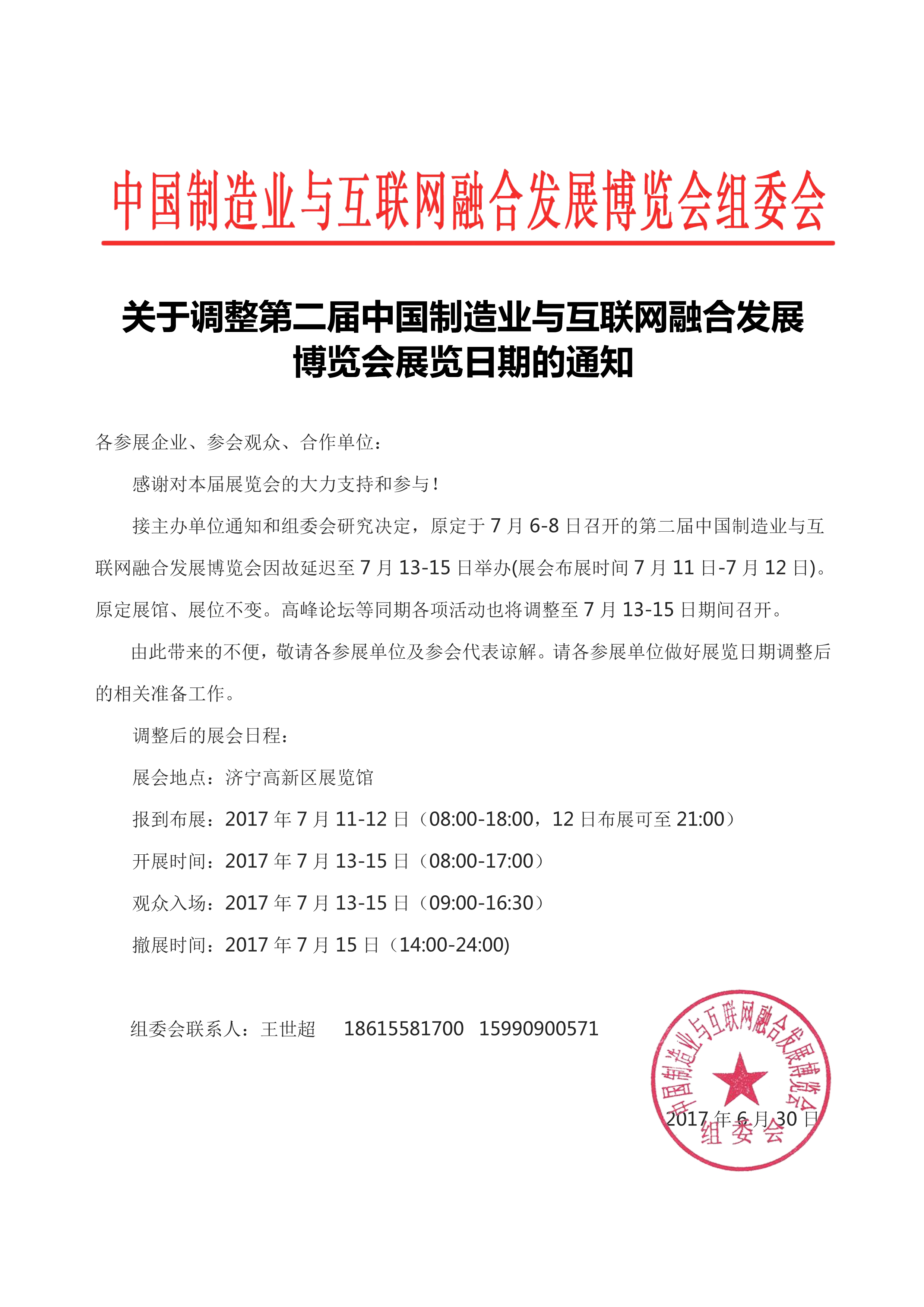 【通知】關于調整第二屆中國制造業(yè)與互聯(lián)網(wǎng)融合發(fā)展博覽會展覽日期的通知